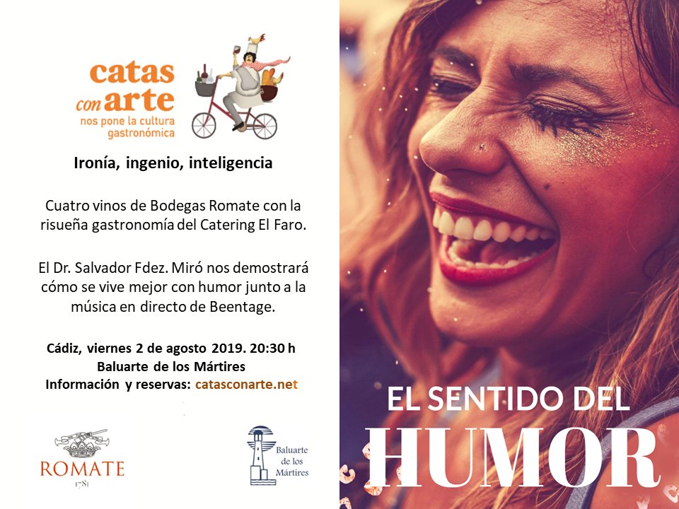 El Dr. Salvador Fernández Miró conoce muy bien el sentido del humor por su participación activa en el Carnaval de Cádiz y nos demostrará cómo se vive mejor con el humor con los impresionantes vinos jerezanos de Romate en el Baluarte de los Mártires el próximo viernes 2 de agosto de 2019. Contaremos con la música en directo de Beentage, la actuación teatral de Txapela, la gastronomía del Catering El Faro y la fotografía de María José Crespo.